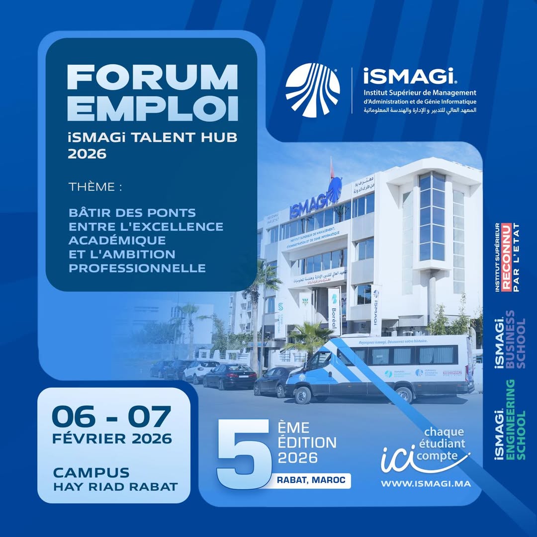 Les 06 et 07 février 2026, le campus de l’iSMAGi à Hay Riad (Rabat) se transforme en un véritable écosystème de rencontres. Que vous soyez un étudiant en fin de cursus ou un alumni à la recherche de nouveaux défis, cet événement est votre tremplin.